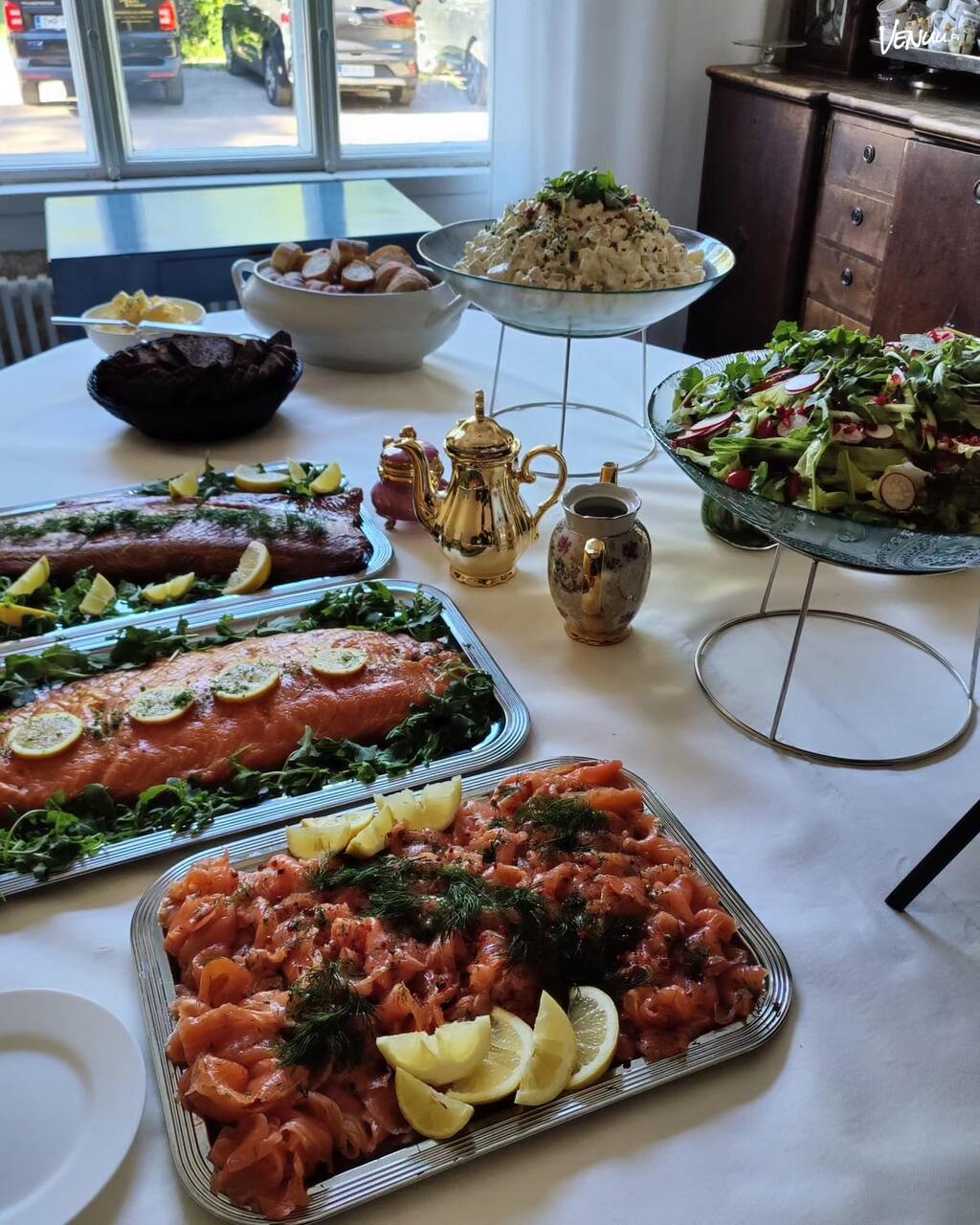 Cateringin ytimessä on sesongin parhaista raaka-aineista valmistettu ruoka, joka voi olla yhtä hyvin perinteistä suomalaista kuten karjalanpaistia tai raikasta ja modernia kasvisruokaa. Erityisruokavaliot ja allergiat huomioidaan tarkasti, jotta jokainen vieras voi nauttia kokemuksesta.