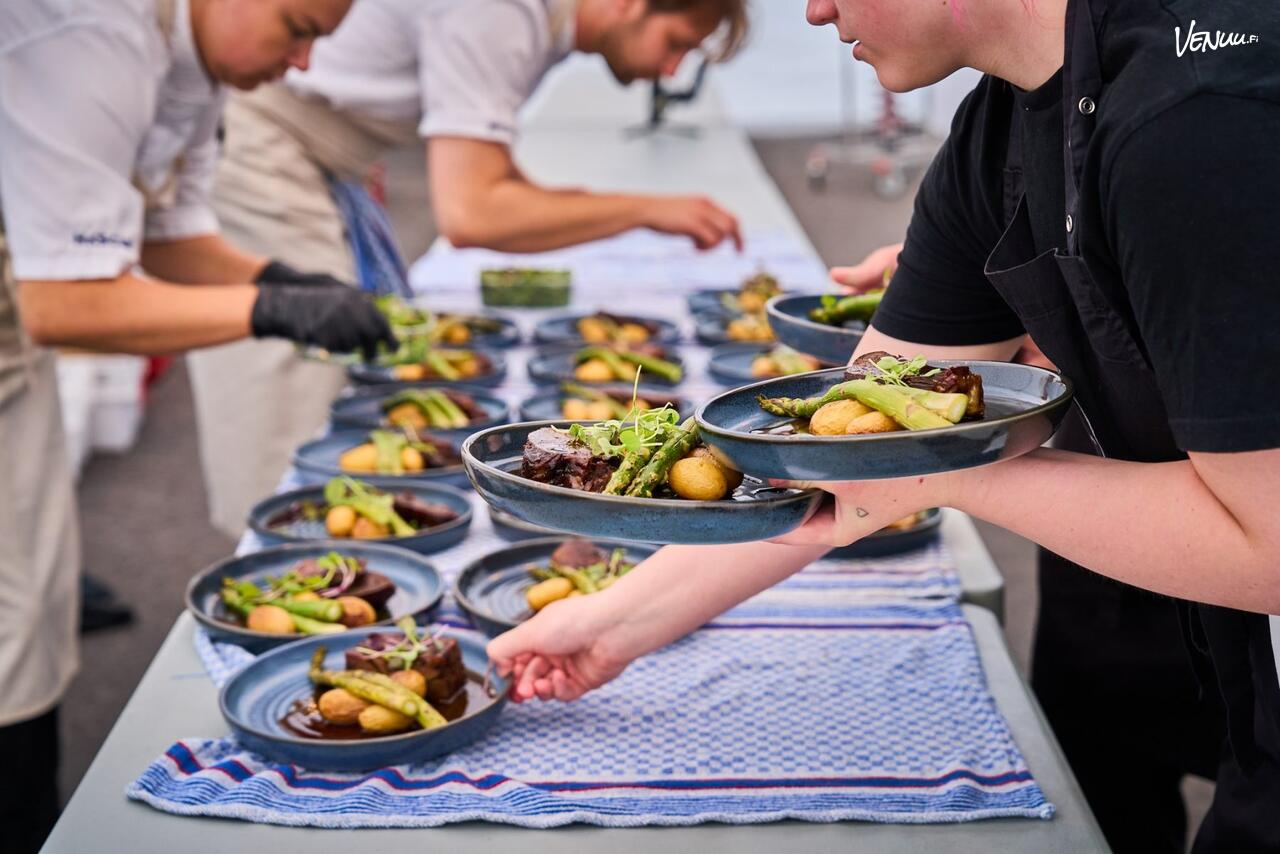 Tiimi käyttää raaka-aineita, jotka ovat sesongin mukaisia ja paikallisesta lähituotannosta. Ruoat valmistetaan huolella ja tarjoillaan siististi, ja asiakas voi halutessaan valita palvelun, joka sisältää myös astiat ja tarjoiluhenkilökunnan. Näin tilaaja voi keskittyä vieraisiin ja tilaisuuden kulkuun ilman huolta tarjoilusta.