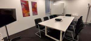 JYVÄSKYLÄ. Tämä edullinen kokoustila on tyylikkään modernisti sisustettu. Tilasta löytyy sekä iso neuvottelupöytä että pienempi lounge-alue.
