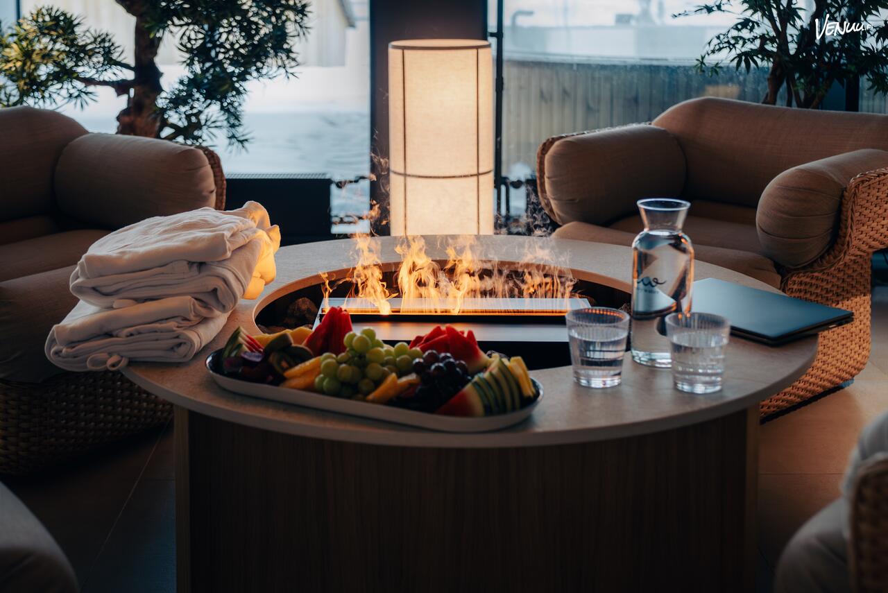 Tila soveltuu erinomaisesti niin kokouksiin kuin elämyksellisiin tilaisuuksiin, joissa yhdistyvät tehokas työskentely ja kokonaisvaltainen hyvinvointi. Tunnelmallinen ympäristö takkatulen loimussa tukee luovuutta ja rauhoittumista, ja tilaan on saatavilla näyttö. Kalustukseen kuuluvat spa-loungen viihtyisät istuskeluryhmät ja pedit, jotka mahdollistavat rennon ja epämuodollisen kokousasetelman.