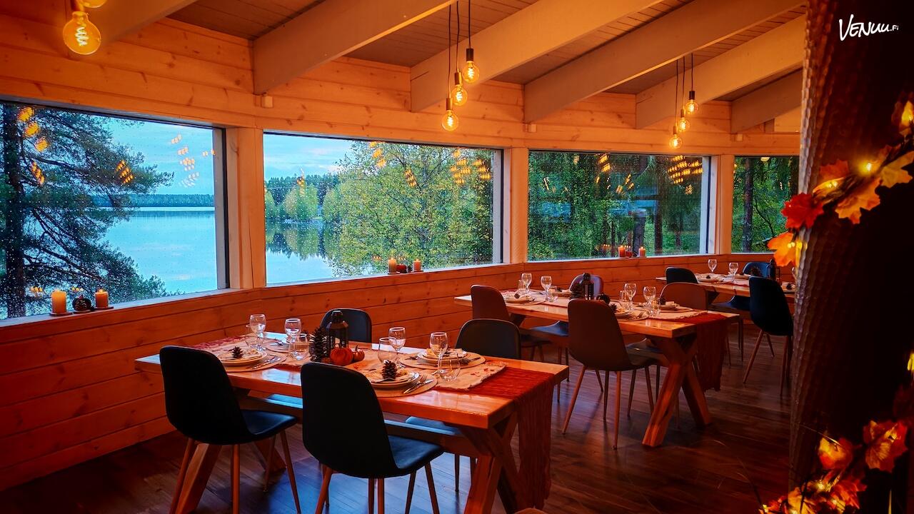 A panoramic venue with windows all around overlooking the majestic landscape of Rokua and Oulu river, surrounded by Nature, yet just 30 minutes from Oulu.