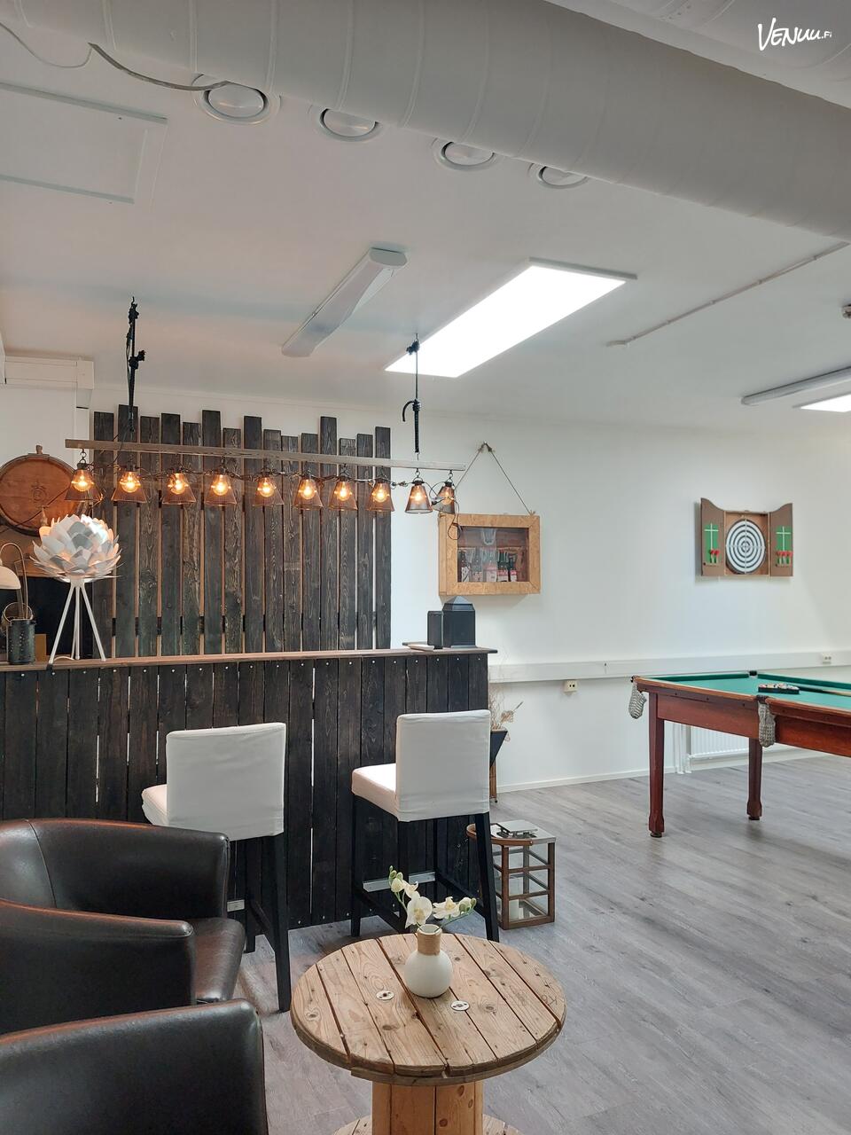 Tilassa on runsaasti viihtyisää oleskelutilaa, ja varusteluun kuuluu muun muassa biljardipöytä, darts, useita sohvia, baaritiski, iso ruokapöytä 14–16 hengelle sekä toinen 6-8 hengen ruokapöytä keittiön yhteydessä. Keittiö on hyvin varusteltu ja sieltä löytyvät jääkaappi, pakastin, astianpesukone, liesi, mikro, kahvinkeitin ja vedenkeitin.