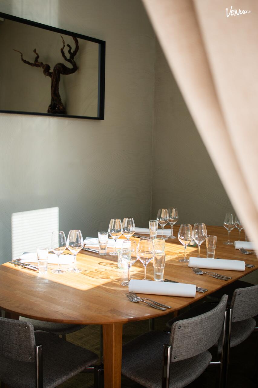 Tilassa on soikea pöytä, jonka äärelle mahtuu kahdeksan ruokailijaa niin, että kaikki näkevät hyvin toisensa.