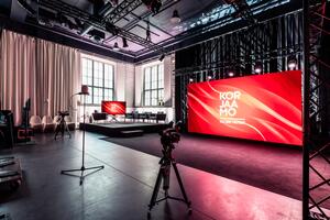 Korjaamon Kulmasali muuntuu monenlaiseen tapahtumaan. Suuret ikkunat valaisevat tilan, mutta tarvittaessa se voidaan pimentää täysin.