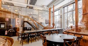 Trendikäs, loft-tyylinen juhla-, sekä kokoustila mahtavan suurien kuparipannujen keskellä.