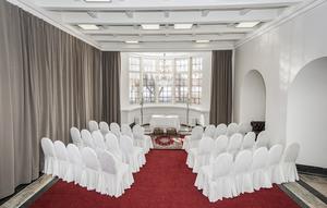 Tilan kauniit kaarevat muodot yhdistettynä upeaan kattokruunuun ja juhlaviin kynttelikköihin tuovat tunnelmaa hääjuhlaan.