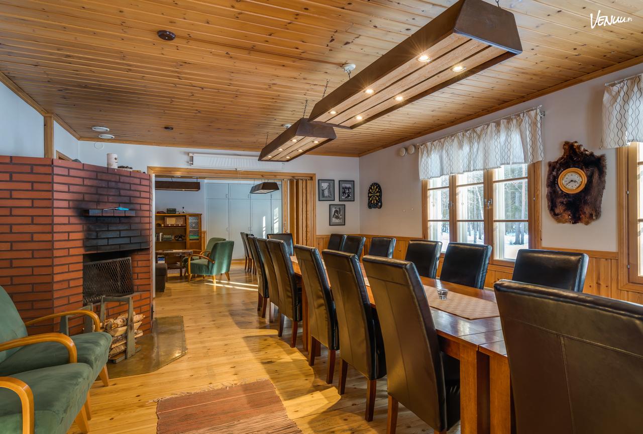 PÄÄSALI JA OLESKELU/KOKOUSTILAT: Päärakennuksen pääsalissa on tilaa noin 25 vieraalle. Varusteina ovat lisämaksuton wifi, fläppitaulu, valkokangas ja 55 tuuman taulutelevisio HDMI-liitännällä. Salin jatkeena on kabinetti, jossa mahtuu myös ruokailemaan noin 10 henkeä. Myös kabinetista löytyy 55 tuuman televisio.