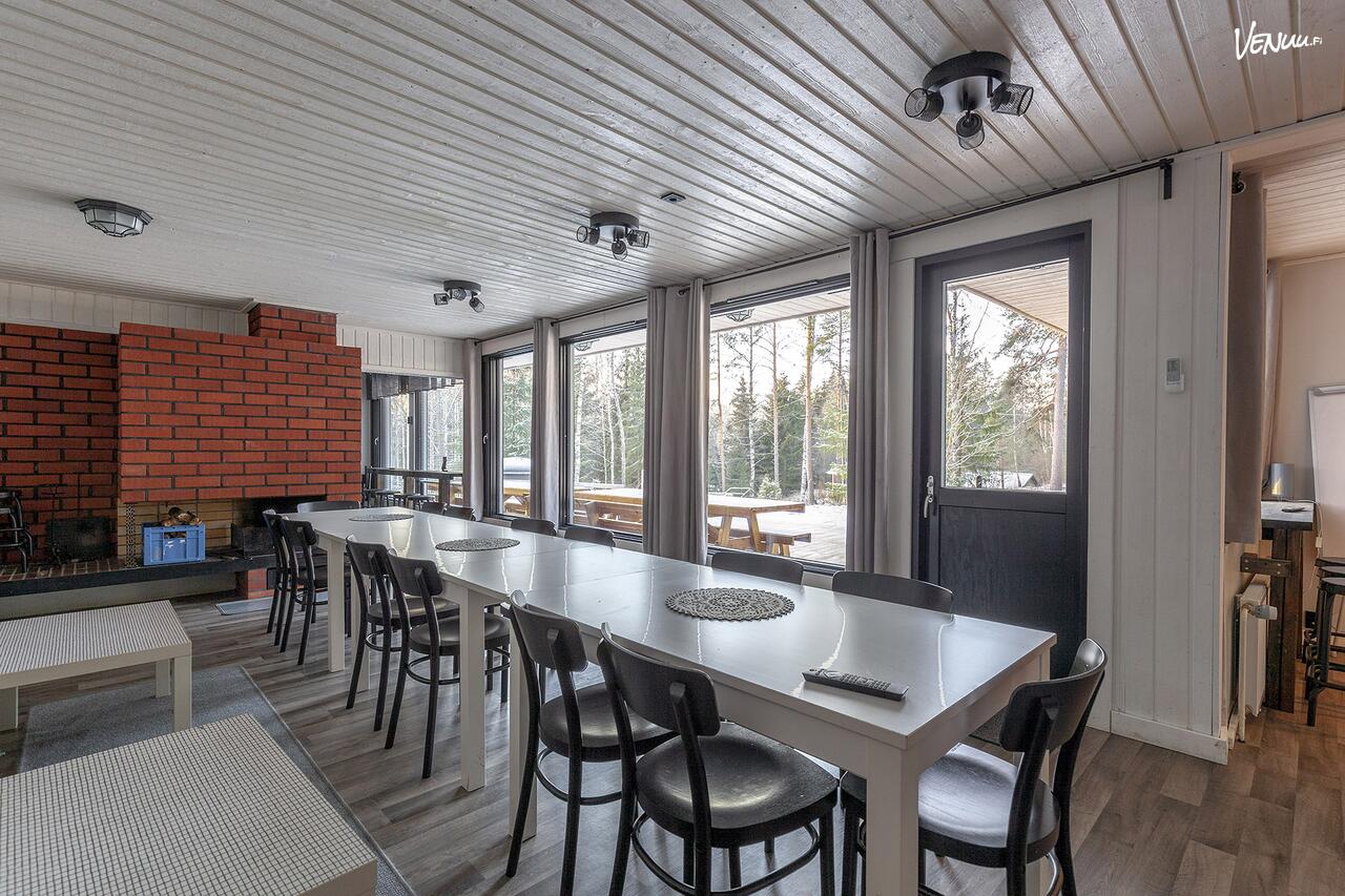 PÄÄSALI JA OLESKELU/KOKOUSTILAT: Noin 45 neliön pääsalissa/kokoustilassa on tilaa jopa 20 vieraalle pitkän pöydän ja ison sohvaryhmän äärellä. Pääsalin avotakan takana on pukuhuone/seurustelutila, jossa on metsäpuutarhaan katsova maisemabaaritiski. Huvila on varustettu lisämaksuttomalla wifi-yhteydellä. Pääsalissa on 70 tuuman taulutelevisio ja pukuhuone/seurustelutilassa sekä kabinetissa 55 tuuman taulutelevisiot.