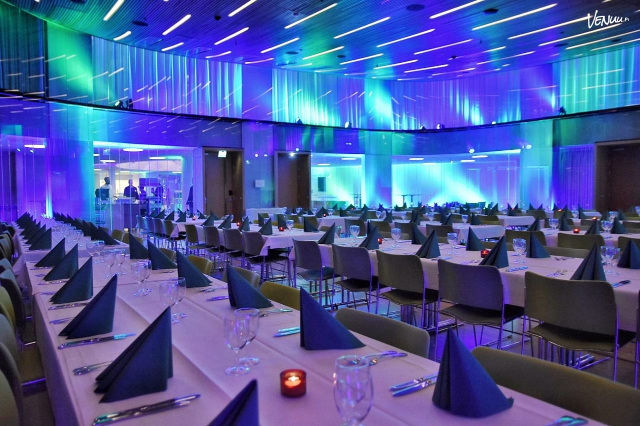 Pöytäryhmät à 8 henkeä kokouskäytössä, max 160.