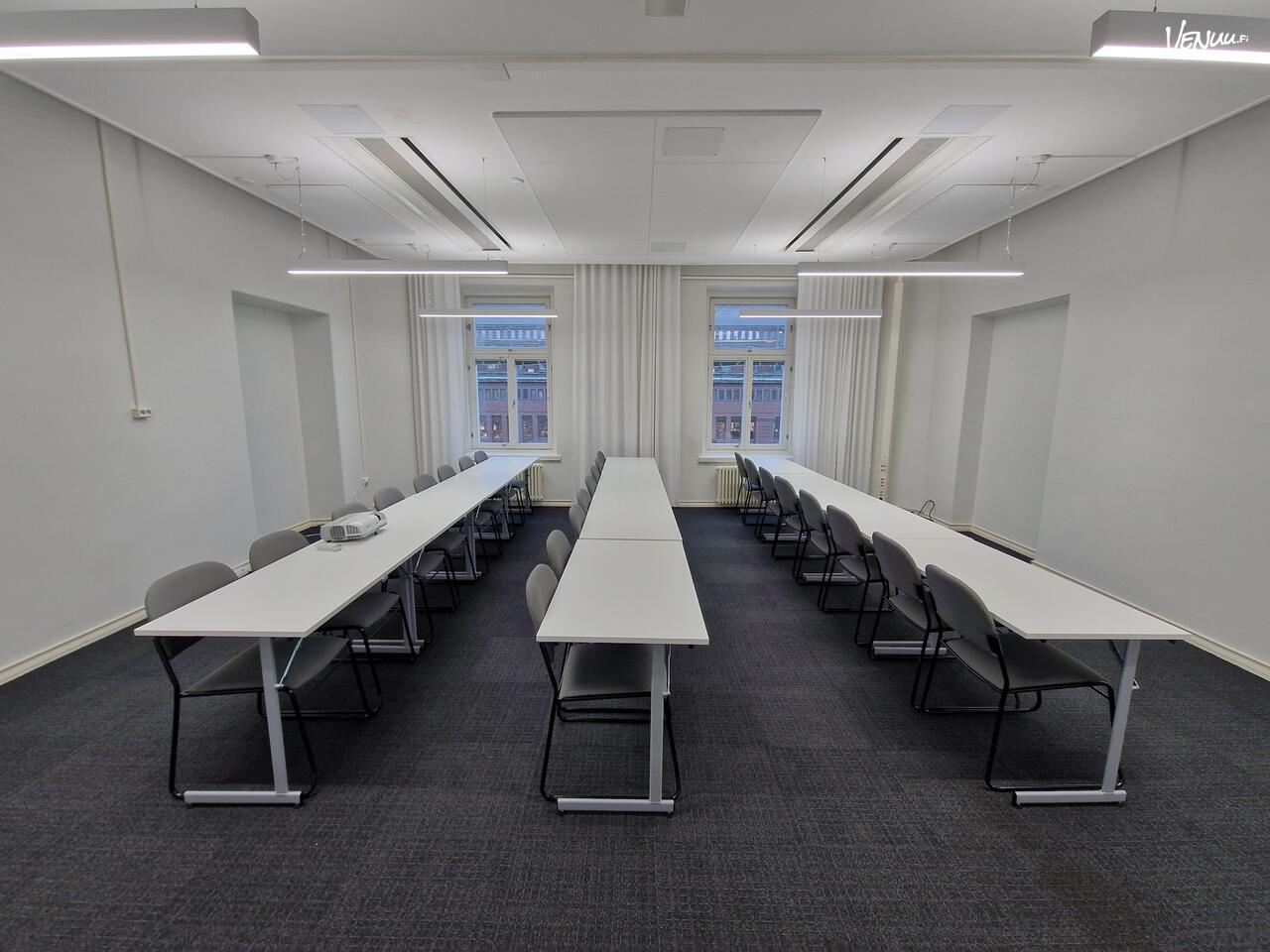 Tämä moderni neuvottelutila tarjoaa paikat jopa 24 henkilölle ja soveltuu erinomaisesti kokouksiin, koulutuksiin ja workshop-tilaisuuksiin. Irrotettavien pöytätasojen ansiosta tilaa voidaan mukauttaa helposti erilaisiin asiakastarpeisiin.