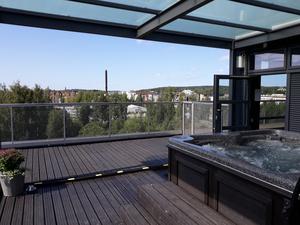 Täällä pääset nauttimaan upeasta Iki-kiukaalla varustellusta saunasta ja kattoterassilla sijaitsevasta porealtaasta. Terassilta avautuu hienot näkymät Hämeenlinnan keskustaan.
