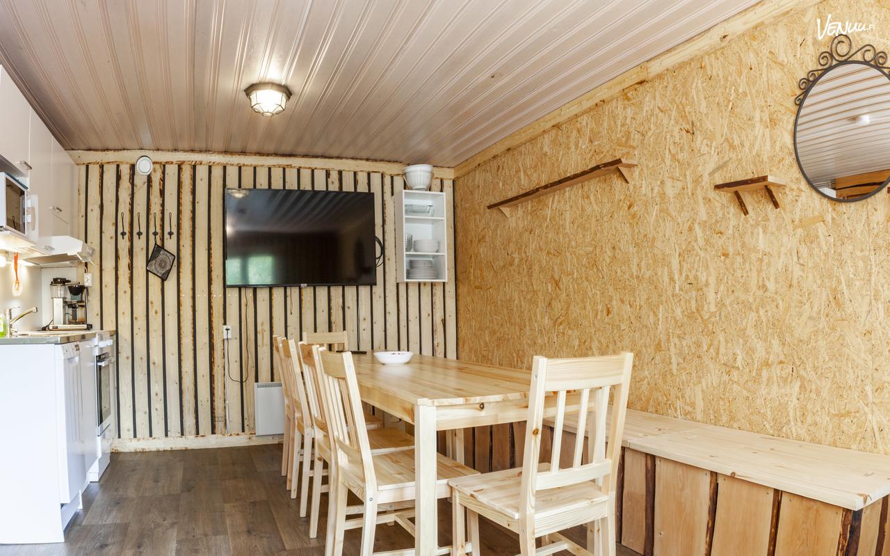 OLESKELU/KOKOUSTILAT: Minihuvilan tupakeittiössä on noin 2,5 metriä pitkä pöytäryhmä, jossa on tilaa 8 hengen ruokailuun ja yhdessäoloon. Tupakeittiössä on myös yksi vuodesohva. Televisiona ja kokousnäyttönä palvelee 50 tuuman taulu-tv.