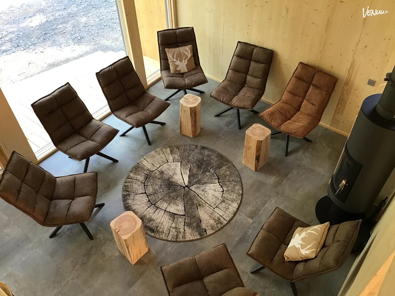 Mukavia nojatuoleja olohuoneessa 6-8 kpl, herkuttelutilassa suuri pirtinpöytä (16 istujaa), alakerrassa isohko makuuhuone.