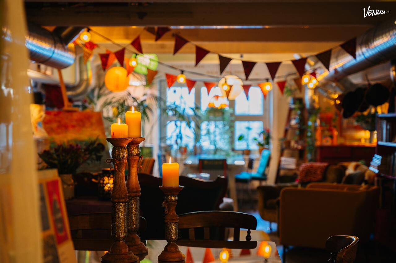 Mukava tila mihin tahansa juhlaan. Erilaiset pöytä- ja sohvaryhmät mahdollistivat rennon seurustelun. Pakettiimme kuului kahvit ja pikkuleivät sekä lapsille maalausta. Lapset viihtyivätkin hyvin koko kolmen tunnin juhlan ajan. Meitä oli 20 juhlijaa.