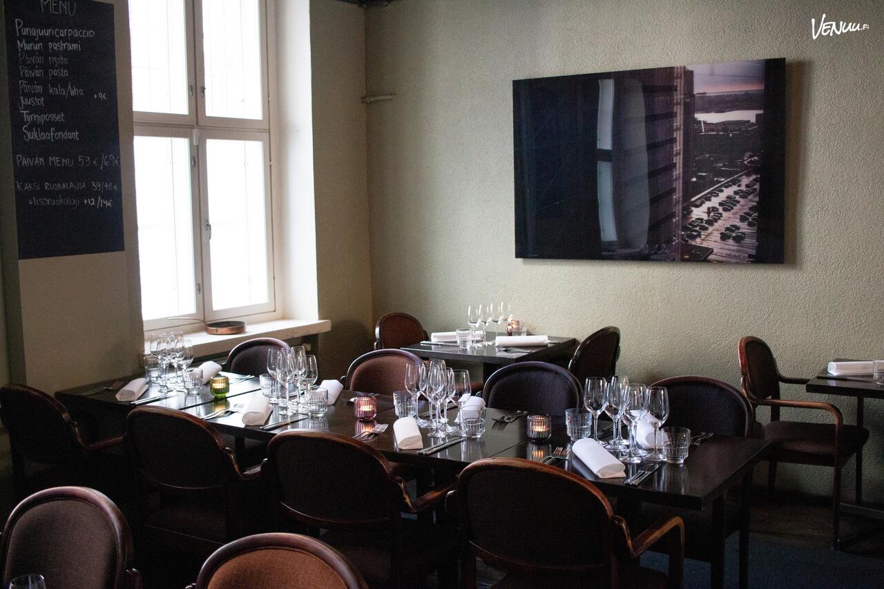 Riippuen henkilömäärästä takasaliin mahtuu mukavasti 25 hlö tai mikäli henkilömäärä on pienempi esimerkiksi 16 hlö saamme rakennettua yksityistilaisuutta varten leveän diplomaattipöydän.