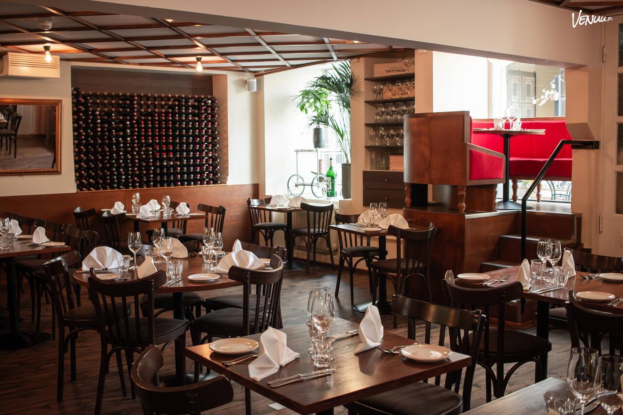 Pastiksen takasaliin saamme maksimissaan 44 hengen seurueen. Seinä - sekä oviaukkojen kohdalla verhot - erottavat tilan etusalista täysin omaksi tilaksi.