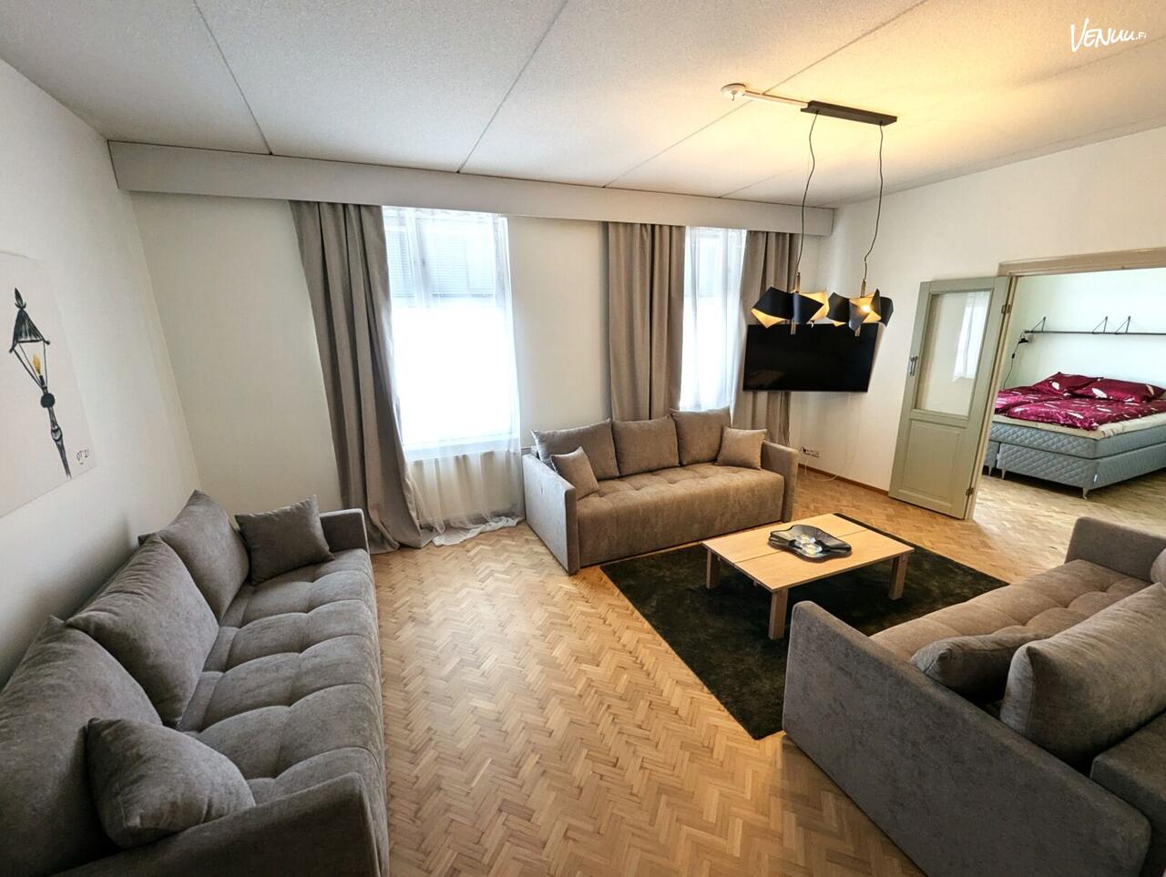 Huoneisto on suunniteltu palvelemaan monipuolisesti; sieltä löytyy kolme erillistä makuuhuonetta, viihtyisä olohuone sekä erilliset neuvottelutilat virallisempiin tapaamisiin ja palavereihin. Täysin varusteltu keittiö mahdollistaa tarjoilujen järjestämisen vaivatta. Tila soveltuu erinomaisesti myös useamman päivän tapahtumiin, sillä majoitustilaa on jopa 16 henkilölle. Päivän tai illan päätteeksi rentoutumisen kruunaa huoneiston oma sauna.