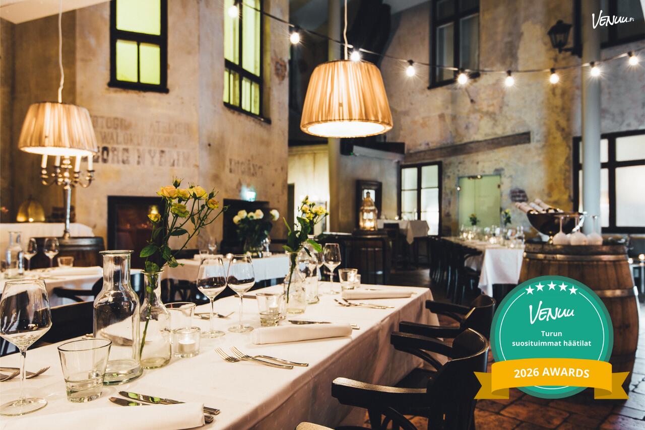Tila on jaettu kahteen kerrokseen. Mikäli henkilömäärä on 60 tai vähemmän, saamme illallisen parhaiten katettua yläkertaan.